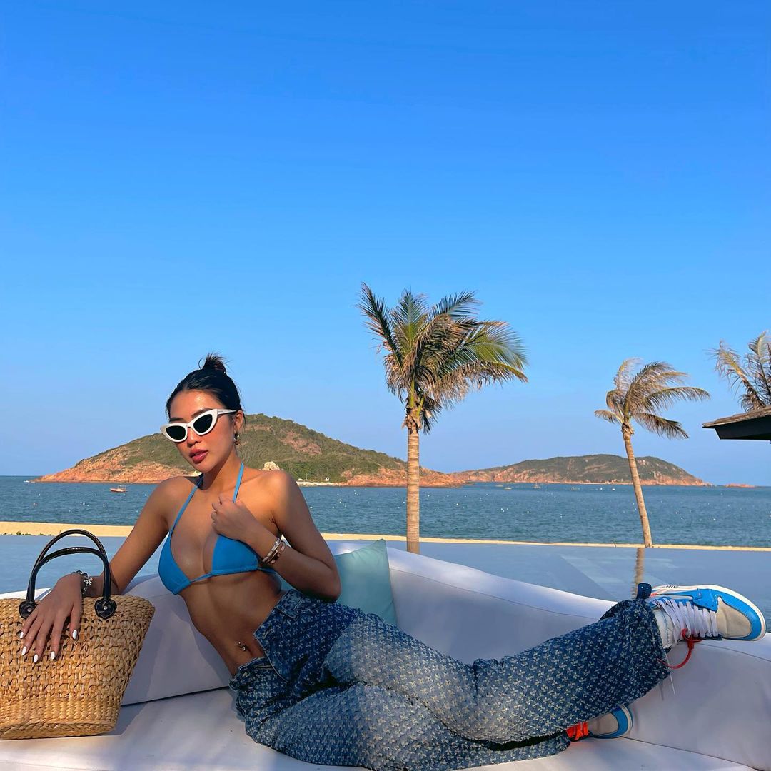 Hương Giang chọn diện bộ swimsuit đến từ nhà mốt Balmain, thiết kế với phần lưng cut-out rộng càng giúp hình ảnh của cô thêm bội phần gợi cảm.