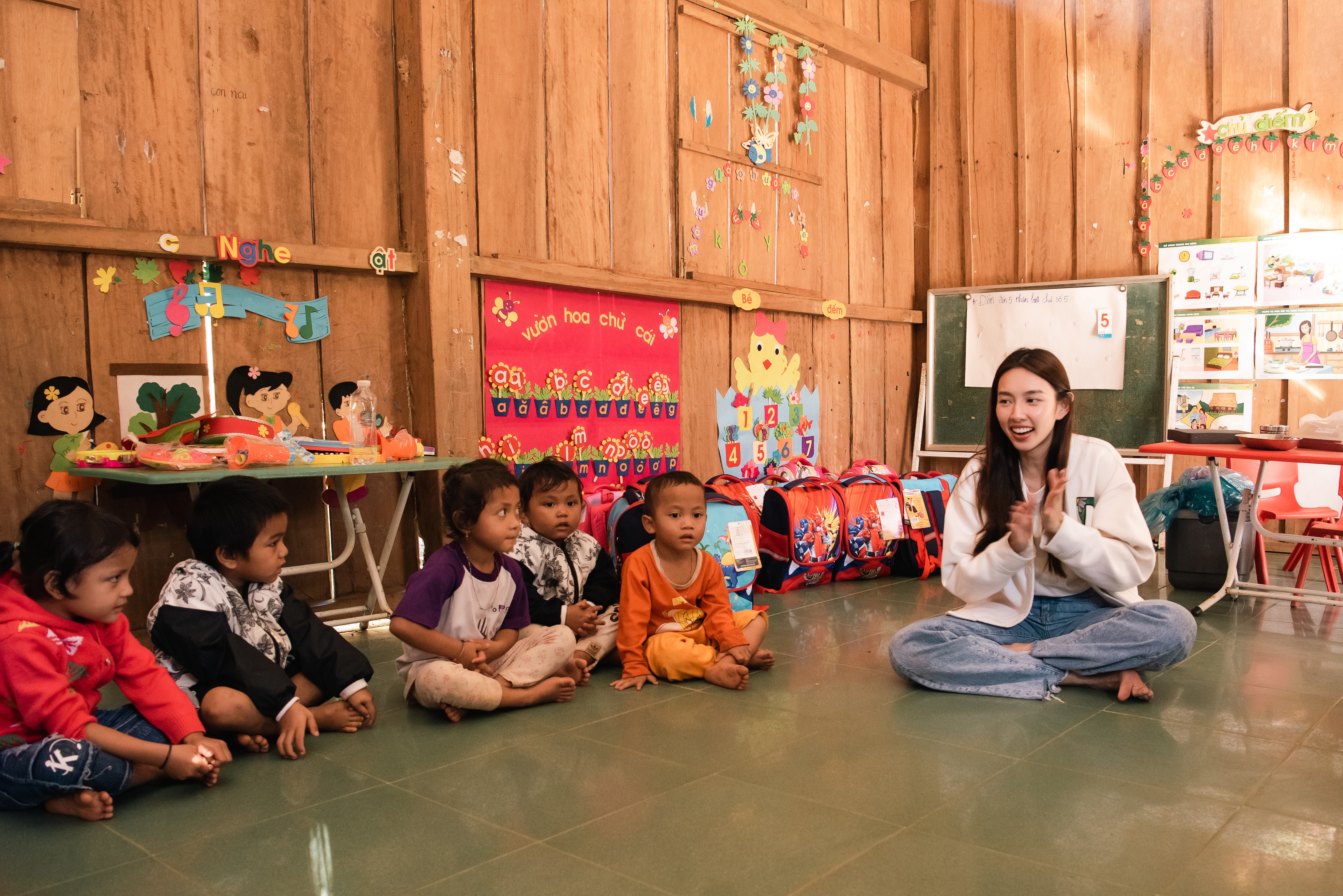Nàng hậu trao đi 50 phần quà gồm có cặp sách, dụng cụ học tập, giày dép, cùng với đó là 50 triệu đồng hỗ trợ xây trường, với mong muốn truyền động lực cho các em nhỏ được đến trường, xây dựng ước mơ cho riêng mình.