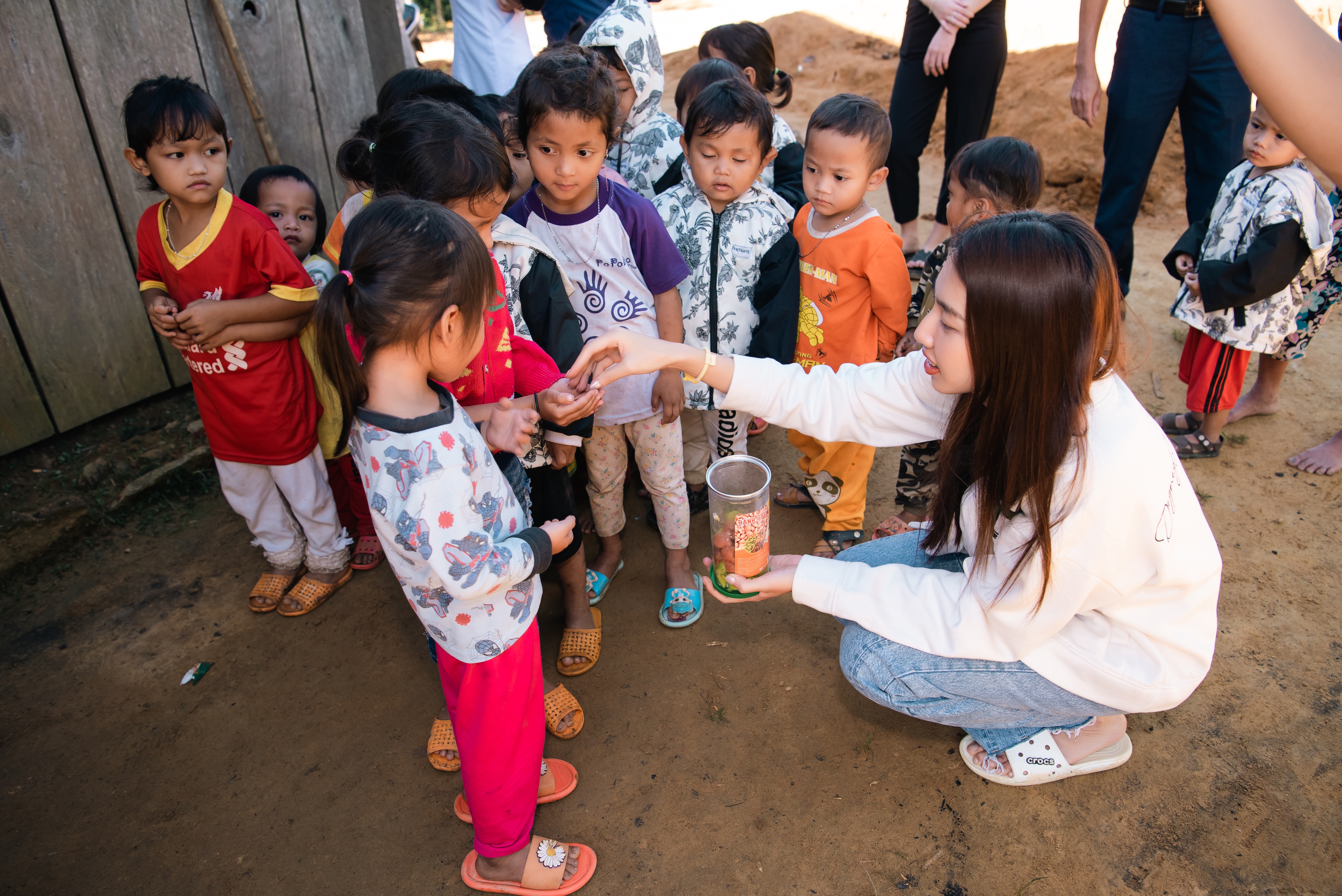 Bên cạnh việc trao tặng quà, Hoa hậu Hòa bình Quốc tế còn tham gia một số hoạt động, mang đến giá trị tinh thần cho các em nhỏ. Với sự thân thiện, gần gũi, Thùy Tiên nhận được rất nhiều sự chào đón, cảm mến từ người dân và các em. Tại đây, nàng hậu cũng tranh thủ ghi lại một số khoảnh khắc kỷ niệm cực dễ thương.
