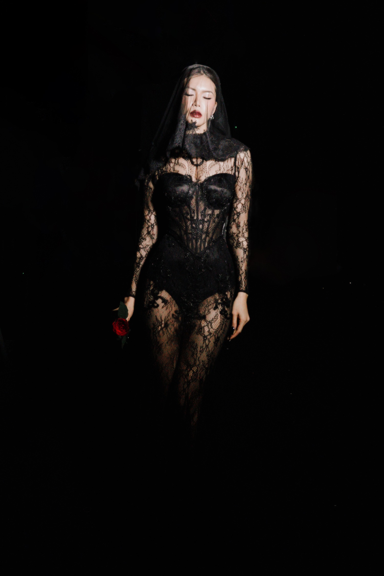 Bộ đầm đen bó sát cơ thể cùng phụ kiện ren đội đầu cô dâu, tay cầm hoa hồng, Minh Tú khiến thảm đỏ chung kết Miss Grand Việt Nam 2023 bùng nổ. Ngay lập tức hình ảnh của cô phủ sóng mạng xã hội với hàng trăm video clip được viral trên mạng xã hội.